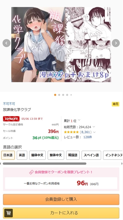 - 『放課後化学クラブ』を読むならDLsiteがおすすめ。音声作品やゲームに使えるクーポンも配布されているので、他の同人作品が欲しくなったときにもお得にお買い物できます。