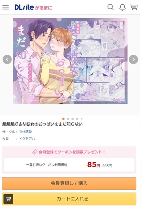 • 『超超超好きな彼女のおっぱいをまだ知らない』を読むならDLsiteがおすすめ。音声作品やゲームに使えるクーポンも配布されているので、他の同人作品が欲しくなったときにもお得にお買い物できます。