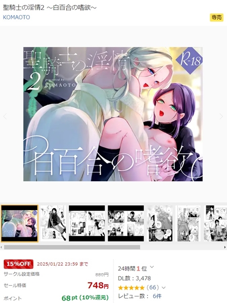 - 『聖騎士の淫情2 ~白百合の嗜欲~』を読むならDLsiteがおすすめ。音声作品やゲームに使えるクーポンも配布されているので、他の同人作品が欲しくなったときにもお得にお買い物できます。