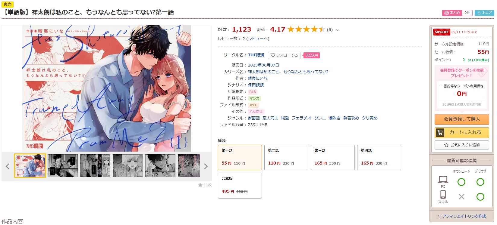 • 『祥太朗は私のこと、もうなんとも思ってない』を読むならDLsiteがおすすめ。音声作品やゲームに使えるクーポンも配布されているので、他の同人作品が欲しくなったときにもお得にお買い物できます。