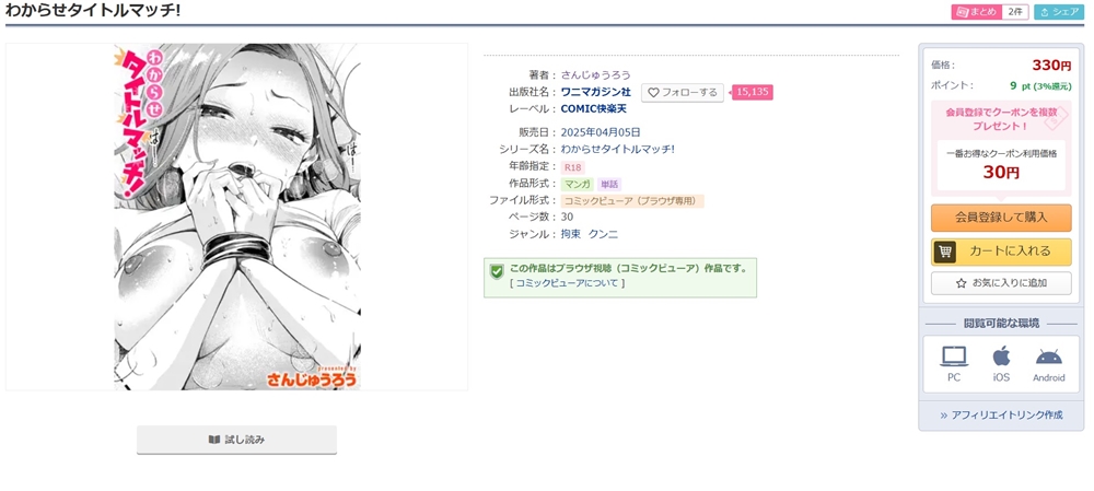 • 『わからせタイトルマッチ!』を読むならDLsiteがおすすめ。音声作品やゲームに使えるクーポンも配布されているので、他の同人作品が欲しくなったときにもお得にお買い物できます。